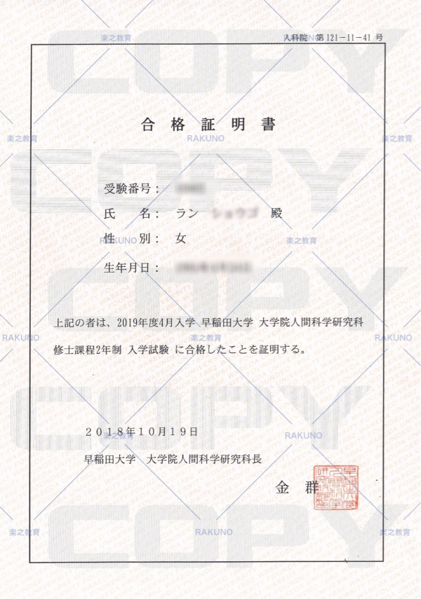 恭喜栾同学合格早稻田大学 大学院人间科学研究科